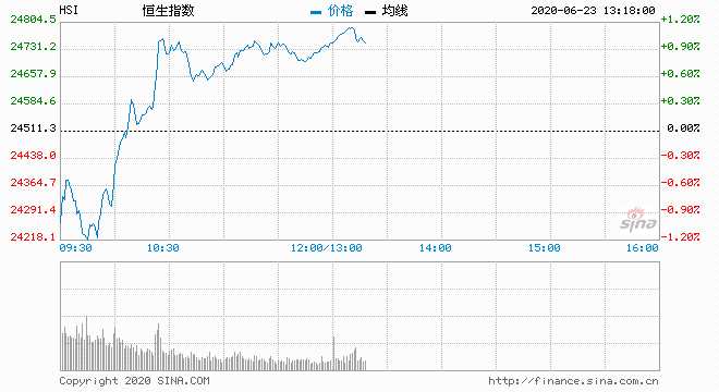 6月23日消息,美股周一收高,科技股領(lǐng)漲。納指創(chuàng)歷史最高收盤紀(jì)錄,科技巨頭蘋果、微軟、Netflix及英偉達(dá)等均創(chuàng)歷史新高。市場(chǎng)仍關(guān)注美國(guó)經(jīng)濟(jì)復(fù)蘇狀況及冠狀病毒疫情的發(fā)展。今日開盤,恒指高開0.12%,隨后走勢(shì)反復(fù)。截止午間收盤,恒生指數(shù)漲0.97%,報(bào)24749.46點(diǎn);紅籌指數(shù)漲漲0.31%,國(guó)企指數(shù)漲0.64%。