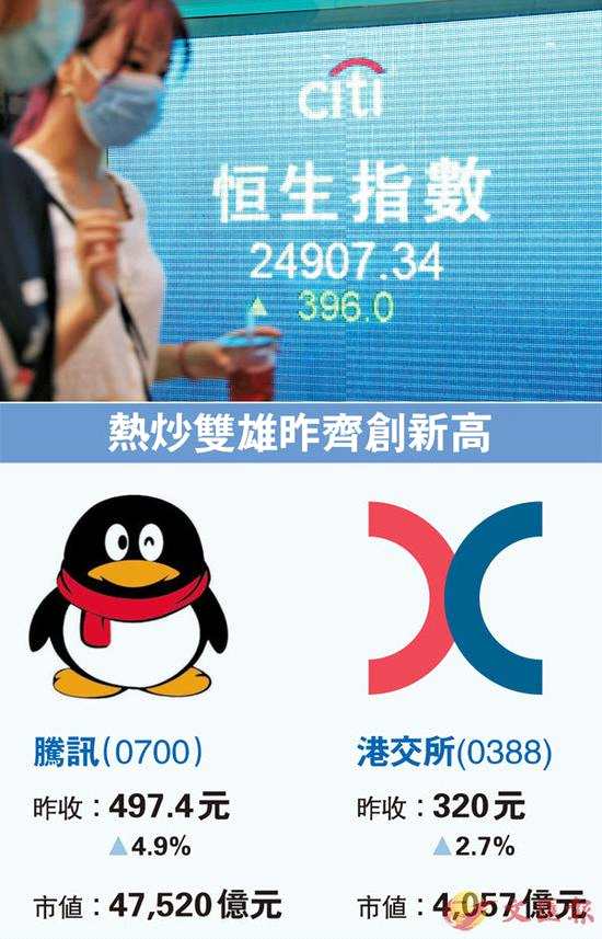 據(jù)香港文匯報(bào)(記者周紹基) 港股昨日全日反覆升396點(diǎn)或1.6%,收?qǐng)?bào)24,907點(diǎn),成交1,199億元。騰訊(0700)及港交所(0388)創(chuàng)歷史新高,前者更挑戰(zhàn)500元大關(guān)。騰訊收市后市值達(dá)47,520億元,再次超越阿里巴巴(9988),重奪“股王”地位。