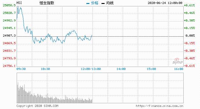 6月24日消息,美股周二收漲,納指及多只科技股均創(chuàng)盤中與收盤歷史新高。冠狀病毒疫苗研發(fā)前景樂觀、國際貿(mào)昜緊張關(guān)系趨緩,令市場得到支撐。美財(cái)長姆努欽稱年底前可能走出衰退。今日開盤,恒指高開0.51%收復(fù)25000點(diǎn)關(guān)口,盤中一度翻綠。截止午間收盤,恒生指數(shù)漲0.06%,報(bào)24921.28點(diǎn);紅籌指數(shù)漲0.1%,國企指數(shù)漲0.11%。