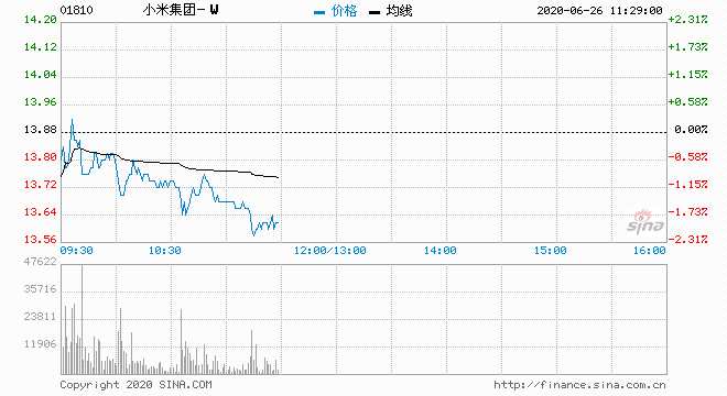 小米集團(tuán)?。?1810) 13.70元 跌1.30%