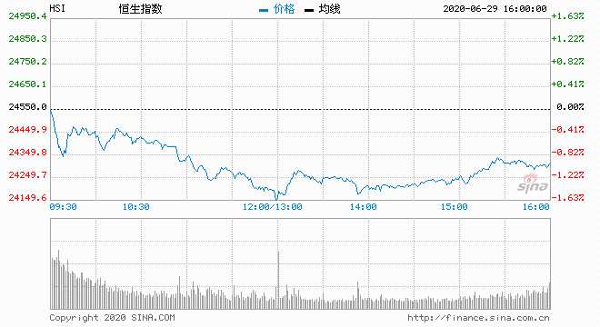 6月29日消息,美股周五大幅收跌,銀行板塊跌幅領(lǐng)先。美國感染病例激增,至少有11個州宣布暫停或推遲重啟計劃。今日早盤,恒指高開低走,截至午盤,恒指跌1.01%報24301.28點,國企指數(shù)跌0.97%,紅籌指數(shù)跌2.06%。