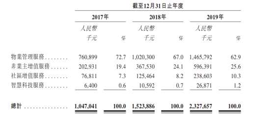 根據(jù)招股書(shū),公司物業(yè)管理服務(wù)收入14.66億元,占比為62.9%,非業(yè)主增值服務(wù)收入占比擴(kuò)大至25.6%。