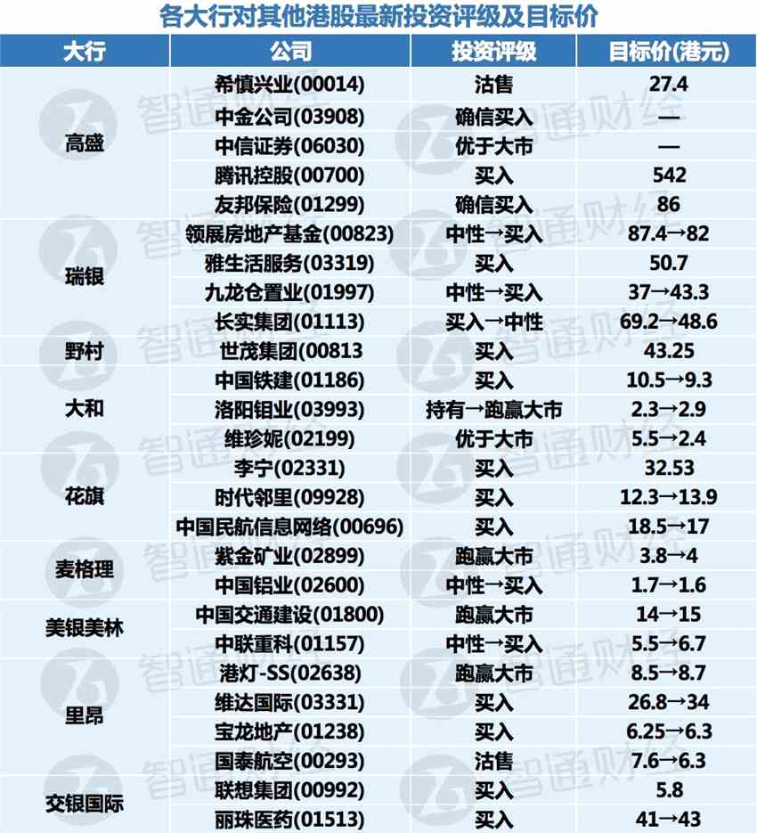 五、各大行對(duì)其他港股最新投資評(píng)級(jí)及目標(biāo)價(jià)