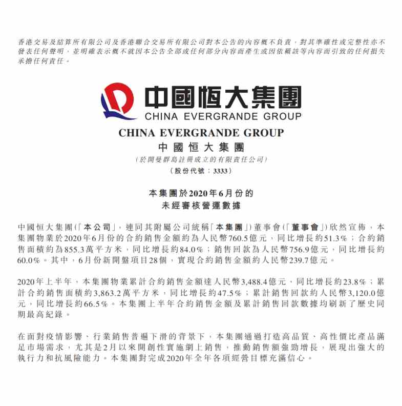 中國(guó)恒大在港交所公告,本集團(tuán)物業(yè)于2020年6月份的合約銷(xiāo)售金額約為人民幣760.5億元,同比增長(zhǎng)約51.3%;合約銷(xiāo)售面積約為855.3萬(wàn)平方米,同比增長(zhǎng)約84.0%;銷(xiāo)售回款為人民幣756.9億元,同比增長(zhǎng)約60.0%。其中,6月份新開(kāi)盤(pán)項(xiàng)目28個(gè),實(shí)現(xiàn)合約銷(xiāo)售金額約人民幣239.7億元。
