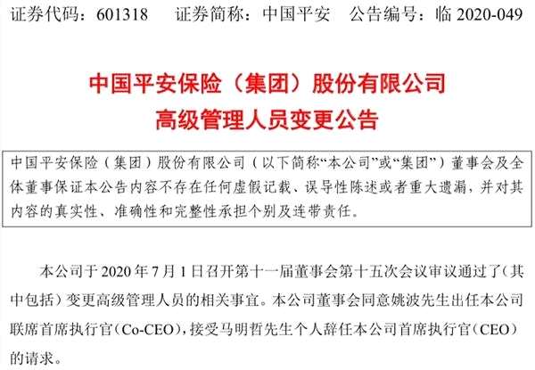 剛剛,中國(guó)平安發(fā)布公告稱,馬明哲卸任平安集團(tuán)CEO,繼續(xù)擔(dān)任董事長(zhǎng),姚波出任聯(lián)席CEO。
