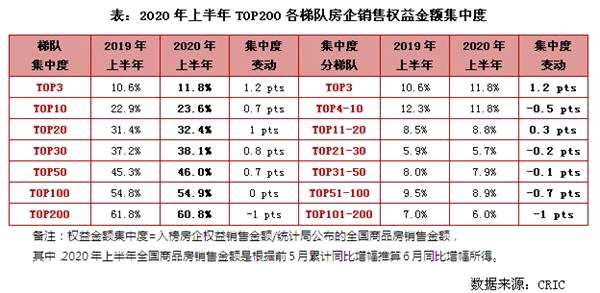 除此之外,2020年上半年,Top 3、10、20、30、50房企銷售權(quán)益金額的集中度分別為11.8%、23.6%、32.4%、38.1%以及46%,相較之下,2019年同期Top 3、10、20、30、50房企銷售權(quán)益金額的集中度分別為10.6%、22.9%、31.4%、37.2%及45.3%。規(guī)模房企頭部化趨勢延續(xù),“強者恒強”。