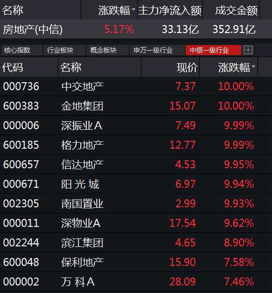盤面上,今日房地產(chǎn)板塊也有不俗表現(xiàn)。截至收盤,房地產(chǎn)板塊上漲5.17%,在中信一級行業(yè)中漲幅位列第一。中交地產(chǎn)、金地集團、格力地產(chǎn)、陽光城等多只股票漲停,萬科、保利、濱江等地產(chǎn)股大漲。
