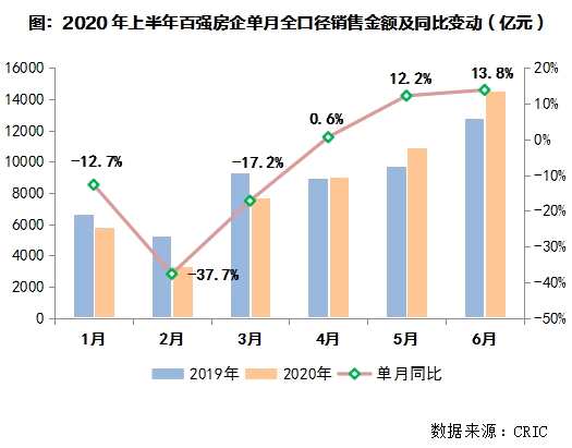 根據(jù)克而瑞公布數(shù)據(jù),受疫情影響,2020年上半年百強房企銷售金額同比下降2.7%。但第二季度以來房地產(chǎn)市場熱度明顯回升,規(guī)模房企抓住市場窗口期,供貨節(jié)奏及營銷去化力度加碼。第二季度,百強房企銷售金額同比上漲9.6%,整體的銷售恢復(fù)情況好于預(yù)期。
