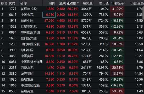 地產(chǎn)股在香港集體爆發(fā),花樣年控股漲26%,中國金茂漲18%,融創(chuàng)中國漲14%,休會(huì)漲13%,佳兆業(yè)漲12%,時(shí)代中國、綠城、奧園等漲超10%
