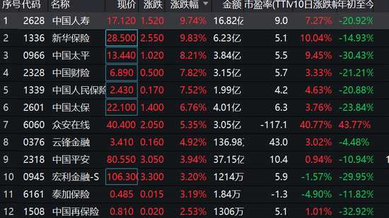 保險(xiǎn)股在香港集體爆發(fā),其中,中國人壽大漲10%,新華保險(xiǎn)(601336,股吧)財(cái)險(xiǎn)漲9.8%,中國天平漲8.2%,中國財(cái)險(xiǎn)漲7.8%,中國人保(601319,股吧)漲7.5%,中國平安漲4%。