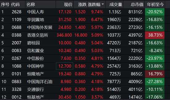 中國人壽暴漲10%領(lǐng)漲藍(lán)籌,華潤置地漲6.5%,港交所漲5%,騰訊漲3%。