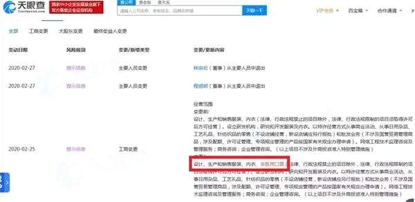 天眼查數(shù)據(jù)顯示,2月25日,廣東都市麗人實(shí)業(yè)有限公司發(fā)生工商變更,經(jīng)營(yíng)范圍新增“設(shè)計(jì)、生產(chǎn)和銷售非醫(yī)用口罩”。