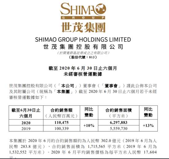 世茂集團:2020年前6個月銷售額1104.8億 同比增10%