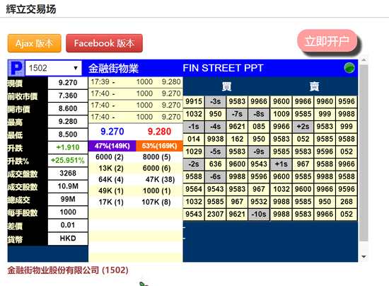 摘要: 7月3日消息,金融街(000402,股吧)物業(yè)暗盤暴漲26%,現(xiàn)價(jià)9.27港元,每手1000股,每手凈賺1910港元。