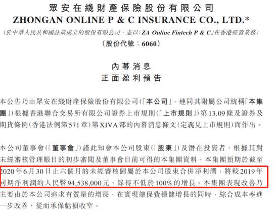 眾安在線:公司上半年歸屬股東凈利錄得至少100%增長