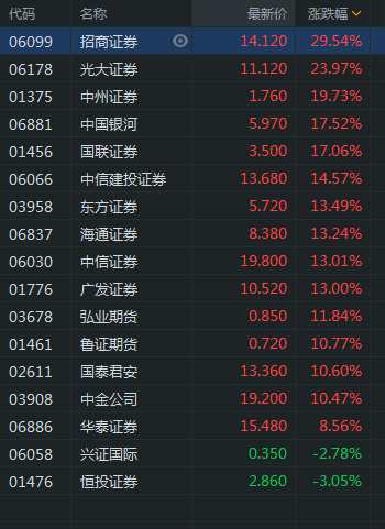 中資券商股繼續(xù)走強(qiáng) 招商證券漲近30%光大證券漲近24%