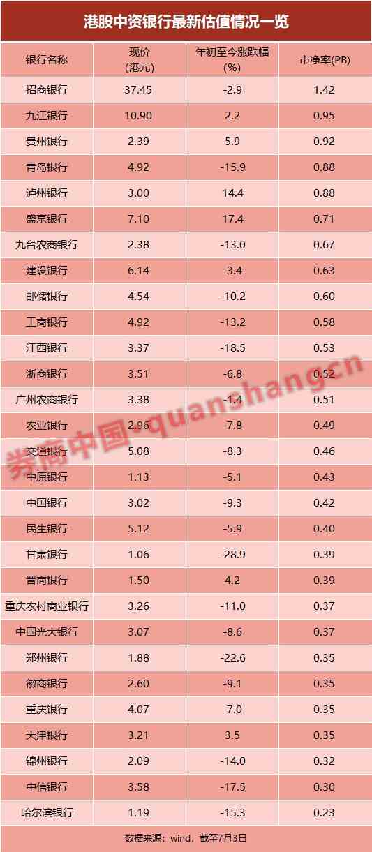 數(shù)據(jù)顯示,截至7月3日收盤,29家港股中資銀行股中,僅僅招商銀行1家沒有破凈,PB在1.42倍,PB高于0.9倍的銀行也只有九江銀行和貴州銀行,其中,與渤海銀行同屬于股份行陣營(yíng)的中信銀行截至7月3日收盤價(jià)3.58港元/股,PB僅0.3,為股份行最低。