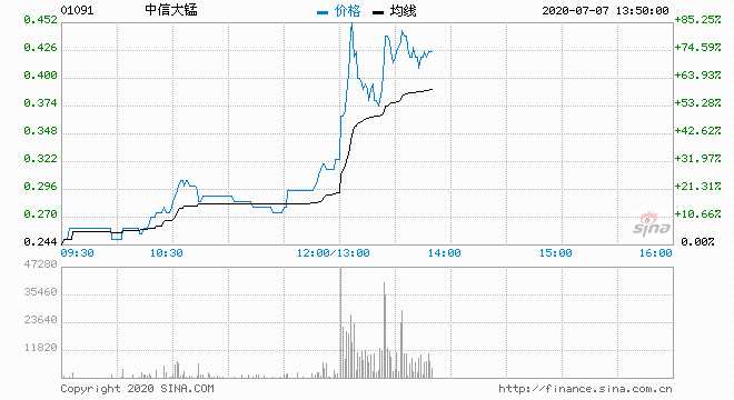 中信大錳急漲51.64%,報0.37元,盤中最高見0.395元創(chuàng)逾11個月高;成交約1761萬股,涉資555萬元。