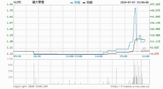 港大零售(01255)升36.75%,報(bào)1.6元,最高價(jià)為1.7元,最低價(jià)為1.12元,主動(dòng)買盤60%;成交58.6萬股,涉資75.25萬元。