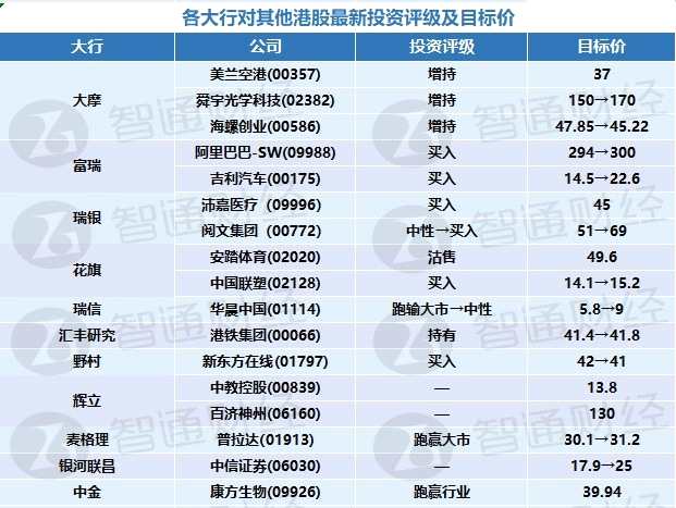 四、各大行對(duì)其他港股最新投資評(píng)級(jí)及目標(biāo)價(jià)