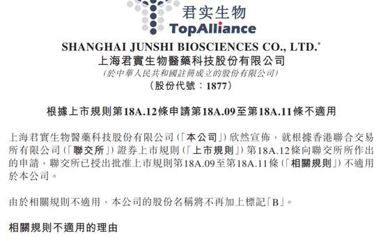 7月10日消息,【君實(shí)生物(688180)、股吧】-B(01877.HK)發(fā)布公告,就根據(jù)聯(lián)交所證券上市規(guī)則第18A.12條向聯(lián)交所所作出的申請,聯(lián)交所已授出批準(zhǔn)上市規(guī)則第18A.09至第18A.11條不適用于公司。由于相關(guān)規(guī)則不適用,公司的股份名稱將不再加上標(biāo)記“B”。