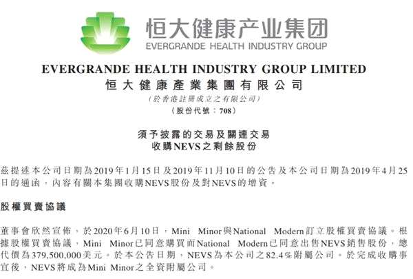 6月10日晚間,恒大健康產(chǎn)業(yè)集團發(fā)布公告稱,以3.795億美元收購NEVS(瑞典國家電動汽車)剩余的17.6%股份,實現(xiàn)全資控股NEVS,成為港股市場唯一一家擁有世界頂尖研發(fā)制造能力的新能源汽車上市企業(yè)。