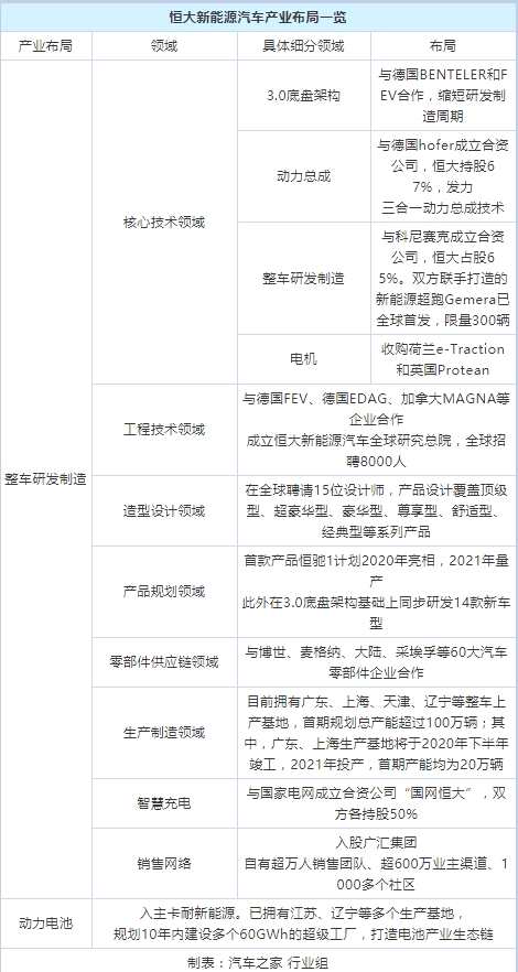 截至目前,恒大通過一系列國際并購和合作,完成了從整車研發(fā)制造、動力總成、動力電池、智慧充電到汽車銷售的全產(chǎn)業(yè)鏈布局。