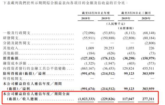 根據(jù)招股書,截至2020年首季盈利3.04億,2019年同期盈利0.99億元;經(jīng)營(yíng)虧損從2019年一季度虧損3.03億減少為2020年同期的1.5億。研發(fā)開(kāi)支按年飆升2.51倍至8018.4萬(wàn)元。2019年全年虧損2.14億元,研發(fā)開(kāi)支達(dá)1.5億元。