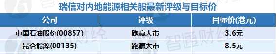 瑞信目前維持中石油及昆侖能源股份“跑贏大市” 評(píng)級(jí),目標(biāo)價(jià)分別3.6港元及8.5港元,瑞信指出中石化冠德的分拆表示該公司的業(yè)績(jī)有潛在上升空間,同時(shí)也將推動(dòng)公司的估值上漲。