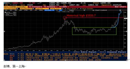 在2008年,由于美國次按危機引爆的環(huán)球金融海嘯,逼令全球央行都推出了量化寬松的貨幣政策。而政策的后延性,亦刺激推動了金價上升。以紐約期金來看,在全球采取了量寬之后的第二年,也就是到了2011年的9月,紐約期金攀升至$1920.7美元的歷史高位(紅色圈線)。其后,紐約期金出現(xiàn)回整,并且在$1000至$1400區(qū)間(綠色方形)、橫盤待升了有六年,然后在2019年年中向上突破,進入了新一輪的升浪。目前,紐約期金已上摸到接近$1900水平了,再創(chuàng)歷史新高、可以說是沒有懸念的了,估計在今年下半年有進一步上試至$2000至$2200的機會,而美元的持續(xù)弱化,會是主要促動因素。