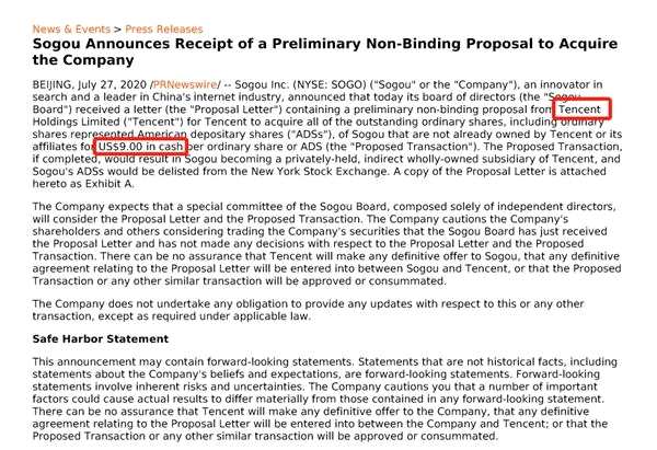 搜狗同時(shí)提醒公司股東,以及其他考慮買賣搜狗股票的投資者,搜狗董事會(huì)剛收到該建議函,并未就建議函及提議中的交易作出任何決定。不能保證騰訊將向搜狗提出任何最終要約,以及搜狗和騰訊之間將達(dá)成任何與建議書(shū)有關(guān)的最終協(xié)議,也不能保證提議的交易或任何其他類似交易將獲得批準(zhǔn)或完成。