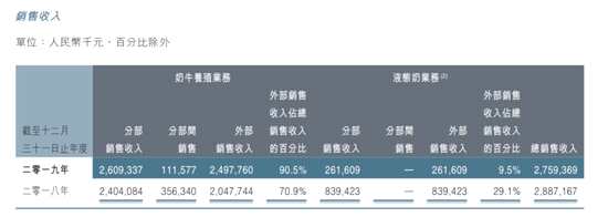 2019年,公司總收入錄得27.59億元,同比上漲17.2%。具體收入方面,奶牛養(yǎng)殖業(yè)務(wù)收入26.1億元,同比上漲8.6%;液態(tài)奶業(yè)務(wù)收入2.62億元,同比下滑69%。