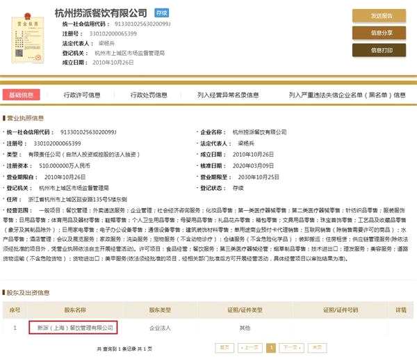 國家企業(yè)信用信息公示系統(tǒng)顯示,杭州撈派餐飲有限公司第十五分公司為杭州撈派餐飲有限公司旗下一家分支機構,杭州撈派餐飲有限公司股東為新派(上海)餐飲管理有限公司。查詢海底撈官網發(fā)現(xiàn),其2019年度報告顯示,新派(上海)餐飲管理有限公司是一家于2013年5月12日在中國注冊成立的有限責任公司,為海底撈全資附屬公司。