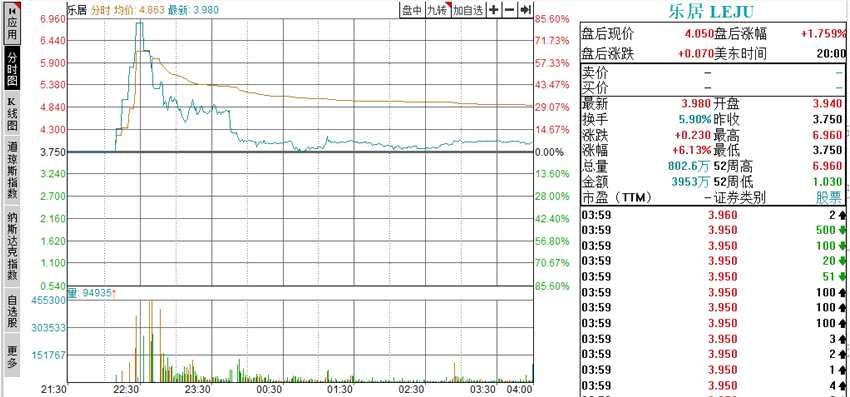 美股上市的樂(lè)居從昨晚10:10:04恢復(fù)交易開(kāi)始,上演驚心動(dòng)魄的一幕,短短不到20分鐘,股價(jià)發(fā)生6次熔斷,一度暴漲82.67%,然后又大幅回落,收盤(pán)漲幅收窄至6.13%。