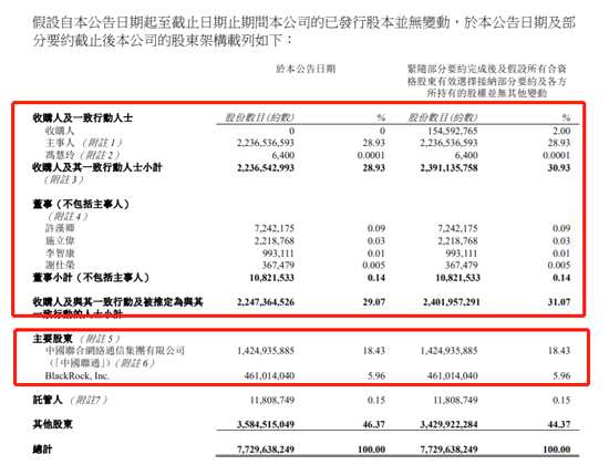 收購(gòu)?fù)瓿珊?,李澤楷持股將?8.93%增加至30.93%,中國(guó)聯(lián)通持股18.43%,黑石持股5.96%。