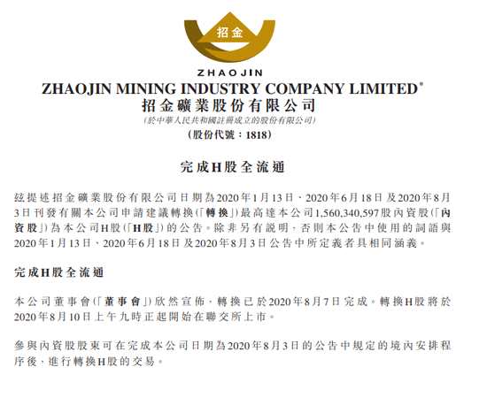 8月10日消息,招金礦業(yè)發(fā)布公告,于2020年8月7日15.6億股內(nèi)資股轉(zhuǎn)換為15.6億股H股。