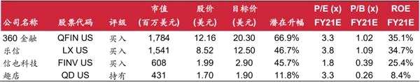 首次覆蓋互聯(lián)網(wǎng)金融行業(yè),給予“優(yōu)于大市”評(píng)級(jí)。經(jīng)歷了過(guò)去幾年的監(jiān)管清理整頓,上市網(wǎng)貸平臺(tái)的FY21E平均市帳率僅為0.8倍,但ROE高達(dá)28%。我們認(rèn)為行業(yè)將迎來(lái)拐點(diǎn),催化劑包括:1)疫情后的消費(fèi)復(fù)蘇推動(dòng)貸款增長(zhǎng);2)寬松的流動(dòng)性和銀行對(duì)高收益資產(chǎn)的渴望進(jìn)一步拉低平臺(tái)的資金成本;3)政策基調(diào)從強(qiáng)調(diào)控風(fēng)險(xiǎn)轉(zhuǎn)為支持行業(yè)有序發(fā)展;4)疫情受控后,資產(chǎn)質(zhì)量顯著恢復(fù),貸款逾期率和回收率均有所改善。360金融是我們的行業(yè)首選,公司在客群、資金、風(fēng)控及合規(guī)性方面具備綜合實(shí)力。