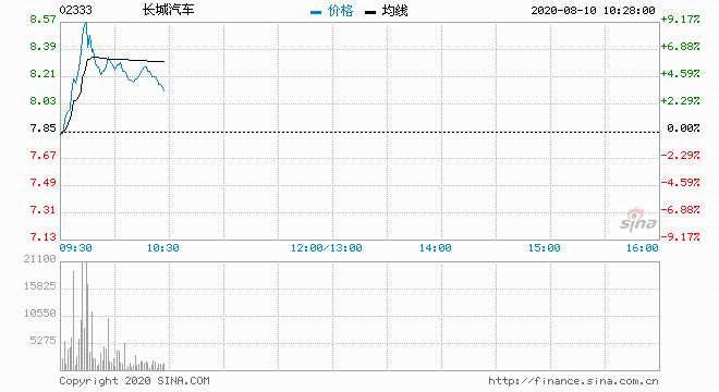 長(zhǎng)城汽車(02333)現(xiàn)價(jià)升9.17%,報(bào)8.57元;成交約1172萬(wàn)股,涉資9730萬(wàn)元.盤中高見8.6元。