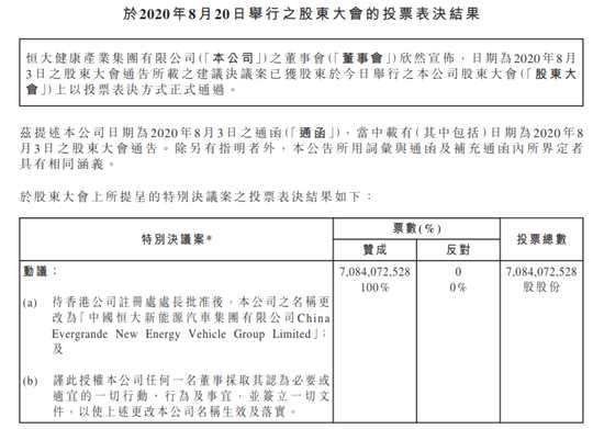 恒大健康(00708.HK)宣布,日期為2020年8月3日之股東大會通告所載之建議決議案已獲股東于今日舉行之本公司股東大會上以投票表決方式正式通過。待香港公司注冊處處長批準(zhǔn)后,本公司之名稱更改為中國恒大新能源汽車集團(tuán)有限公司。