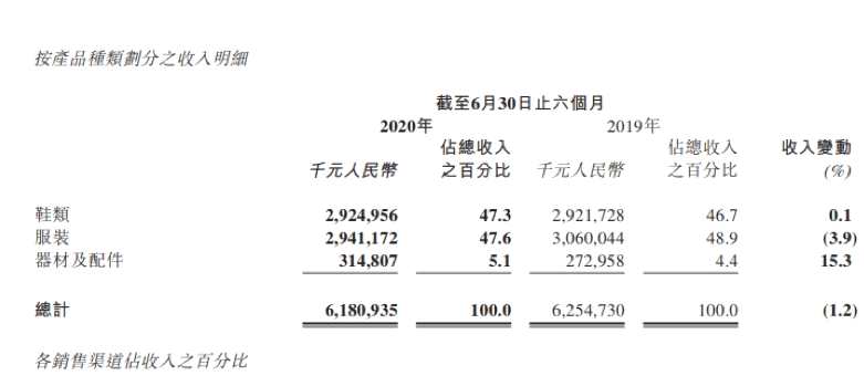 從2020年上半年?duì)I收構(gòu)成來看,其鞋類產(chǎn)品實(shí)現(xiàn)營業(yè)收入29.25億元,同比增長0.1%,占總營收的47.3%;服裝類產(chǎn)品實(shí)現(xiàn)營業(yè)收入29.41億元,同比下降3.9%,占總營業(yè)的47.6%;器材及配件類實(shí)現(xiàn)營業(yè)收入3.15億元,同比增長15.3%,占總營收的5.1%。