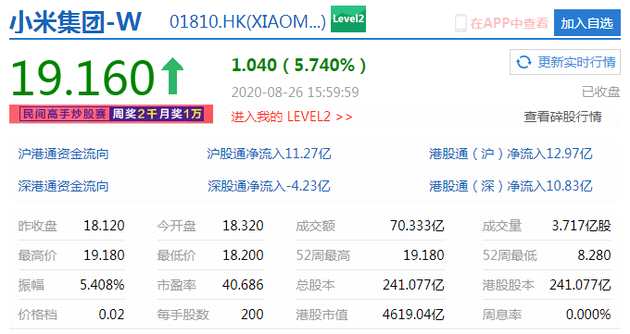 摘要: 查看最新行情新浪科技訊8月26日下午消息,小米集團今日收盤漲5.74%報19.16港元,港股市值4623.87億港元。今日盤中,小米集團漲幅一度擴大至5.5%,股價升至近2年新高。