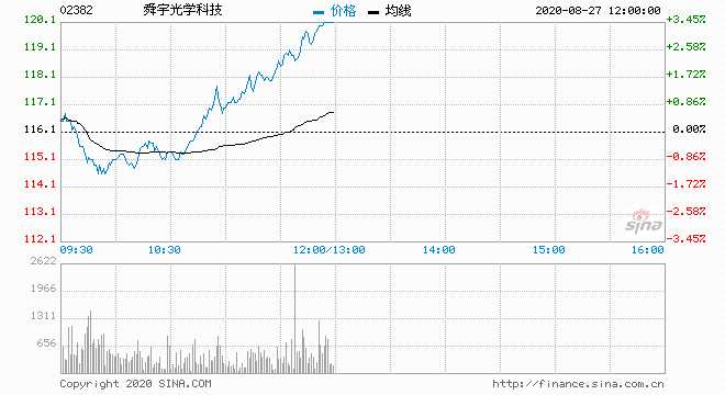 舜宇光學(xué)升逾3% 報(bào)119.7港元