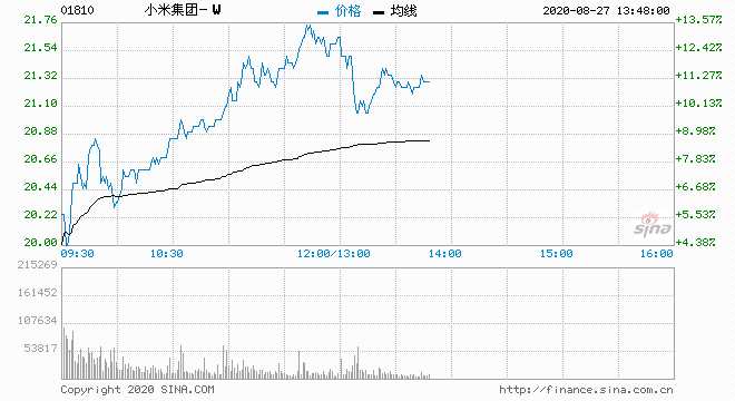 小米今日裂口高開(kāi)逾4%,報(bào)19.96元,之后升勢(shì)迅速擴(kuò)大,最多升13.5%,高見(jiàn)21.75元,創(chuàng)2018年7月以來(lái)新高,中午仍收升13%,報(bào)21.65元.半日錄得11.2億元資金凈流入,短期有望突破歷史高位22.2元.小米半日交投暢旺,成交額高達(dá)77.41億元,為半日成交額最大的個(gè)股,更占大市總成交約9%。