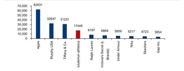 國(guó)外來(lái)看,以全直營(yíng)模式運(yùn)營(yíng)的Lululemon,靠著全球不到500家店,Lululemon去年一年就賺了40億美元(2019財(cái)年數(shù)據(jù))。2017年,Lululemon直營(yíng)店每平方米年銷售額高達(dá)1.7萬(wàn)美元(約合人民幣12萬(wàn)元),耐克甚至不及它的1/3。從2007年上市至今,Lululemon的市值已經(jīng)暴漲17倍,成為了全球市值第三高的運(yùn)動(dòng)品牌,直逼阿迪達(dá)斯。