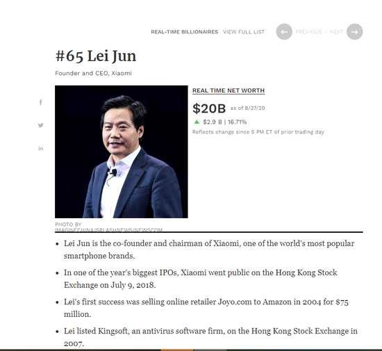 按雷軍持股66.7億股計(jì)算,雷軍持股小米市值從年初的719億港元凈增了507億港元至1226億港元(折合185億美元),凈增715億港元。按福布斯實(shí)時數(shù)據(jù),雷軍身家170億美元,位列內(nèi)地第15大富豪。按福布斯實(shí)時數(shù)據(jù),雷軍身家突破200億美元,位列內(nèi)地第13大富豪,緊追王興。目前王興身家207億美元,美團(tuán)今年暴漲166%。