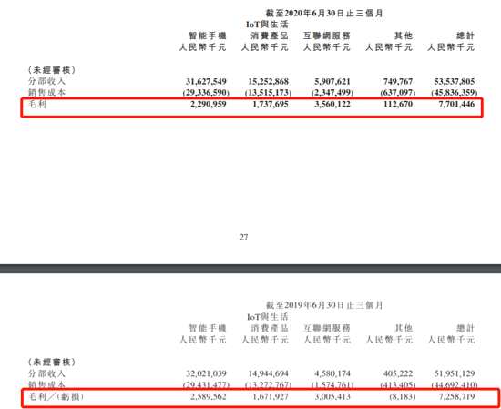 去年同期,小米智能手機(jī)實(shí)現(xiàn)毛利25.9億,IoT與生活消費(fèi)品業(yè)務(wù)實(shí)現(xiàn)16.7億,兩者毛利全部下滑?;ヂ?lián)網(wǎng)服務(wù)盈利去年同期為30億,小米本部分業(yè)務(wù)毛利同比增18.67%,成為公司二季度主要增長點(diǎn)。