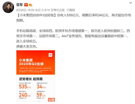 摘要: 8月27日消息,小米集團(tuán)于周三公布業(yè)績,第二季度小米實(shí)現(xiàn)營收535億元,同比增長3.1%;經(jīng)調(diào)整凈利潤同比下降7.2%至34億元。