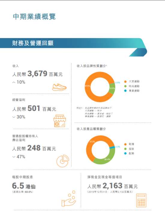 摘要: 8月28日,特步國際公告,截至2020年6月30日止6個月,公司收入36.79億元人民幣(單位下同),同比增長10%;經(jīng)營溢利5.01億元;股東應(yīng)占利潤2.48億元,