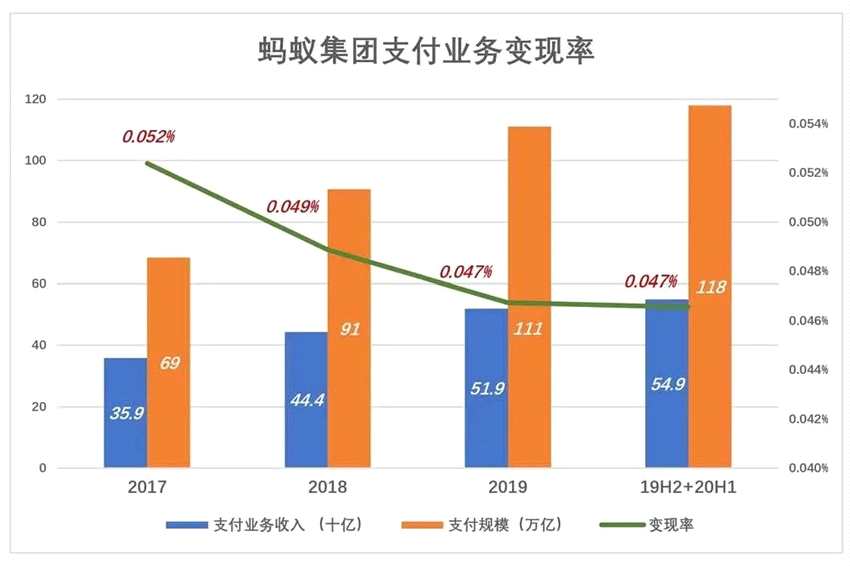 2019年,支付業(yè)務(wù)總交易額達111萬億,相關(guān)收入519億,變現(xiàn)率為萬分之四點七。截至2020年6月末的12個月內(nèi),支付規(guī)模達118萬億,相關(guān)收入549億,變現(xiàn)率仍為萬分之四點七。#第一個#