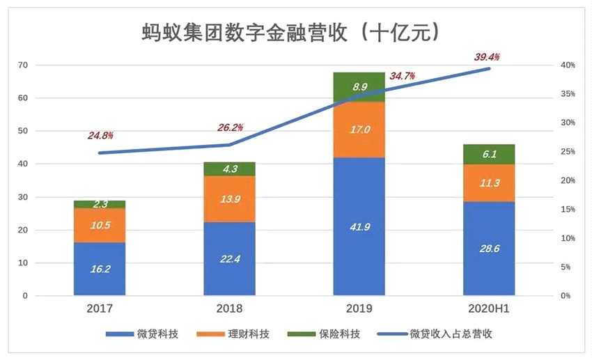 微貸科技營收增長迅猛,2019年達419億,同比增長86.8%,在螞蟻集團營收中的份額達到34.7%。2020年H1,微貸科技營收286億,同比增長59.5%,在總營收中的份額進一步提高到39.4%。